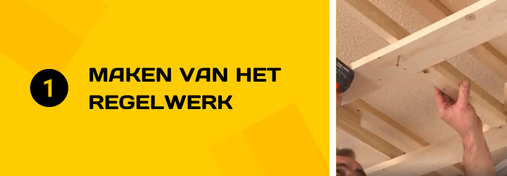 De latten worden eerst verticaal geplaatst en vervolgens horizontaal. Het is daarbij van groot belang dat de hartafstand (afstand van het midden van de ene regel naar de andere regel) afgestemd is op de breedte van de te gebruiken gipsplaten. Dat wil zeggen dat de hartafstand kan variëren van 30 – 60 centimeter. Houd er rekening mee dat het regelwerk de basis is van het plafond en daarom moeten de latten perfect waterpas geplaatst worden. Dit geldt zowel voor een nieuw (verlaagd) plafond als voor een plafond dat op een bestaand plafond geplaatst wordt. Eventuele onregelmatigheden kunnen gecorrigeerd worden met zogenaamde afstandhouders.