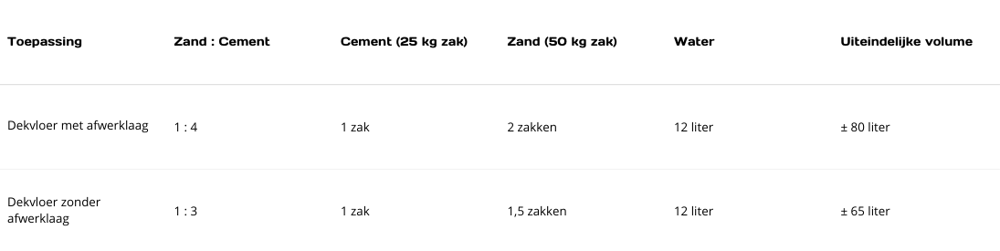 De juiste verhouding hangt vooral af van de dikte van de dekvloer. In onderstaande tabel wordt alles nog eens extra aangegeven.
