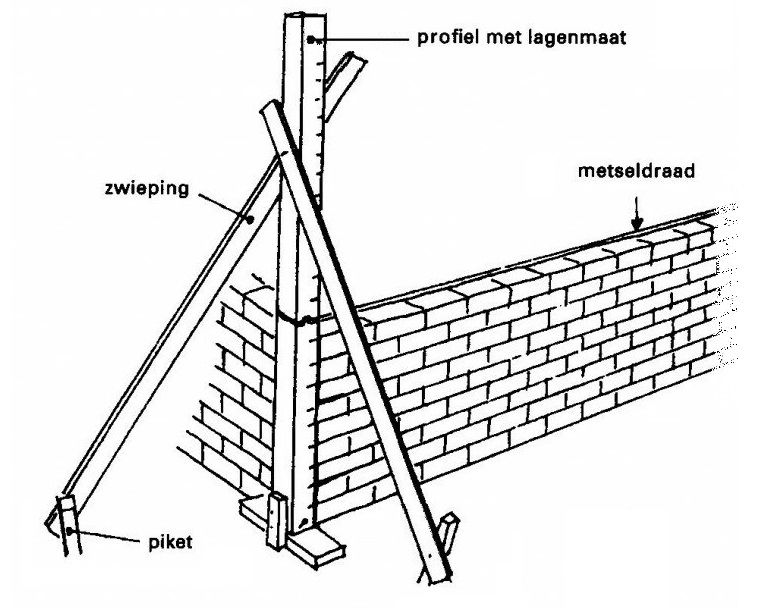 Als kader voor metselwerk worden houten metselprofielen gebruikt. Voor het stellen van deze metselprofielen maakt u eerst twee schoorlatten in een hoek van 90 graden aan het profiel. Bevestig op de hoek- en eindpunten een multiplex plaatje in de betonnen vloer met betonspijkers. Zet elke profielbalk op het multiplex plaatje. Let op dat de schoorlatten hierbij aan de buitenkant komen, zodat deze u niet verhinderen tijdens het metselen. Als het metselprofiel rechtop staat kunt u deze fixeren door de schoorlatten vastte timmeren aan paaltjes in de grond. Controleer daarna met een waterpas of de profielen loodrecht staan. Dit gaat de basis vormen voor uw metselwerk.